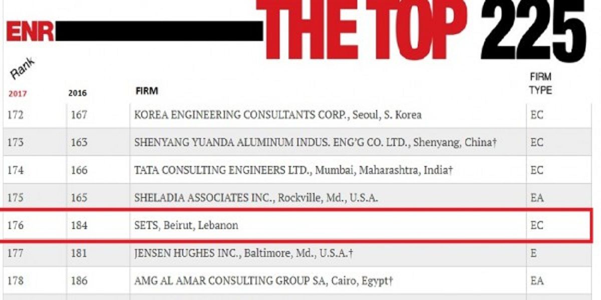 For the second year in a row, SETS has been included in Engineering News Record’s (ENR) list of the Top 225 International Design Firms. This year, the company has improved in its ranking from 184 to 176 worldwide, and is now among the top 10 design firms in the Middle East.
